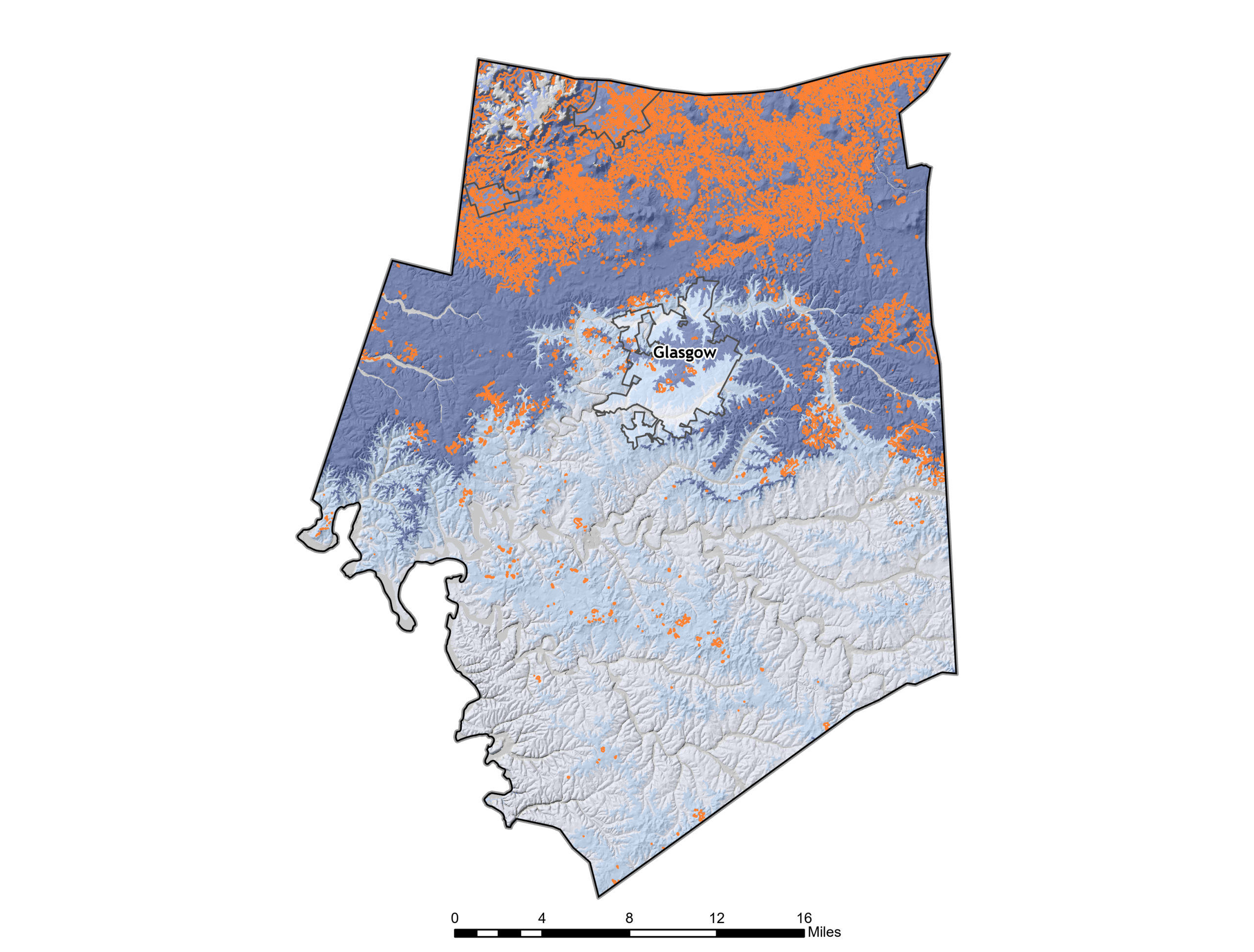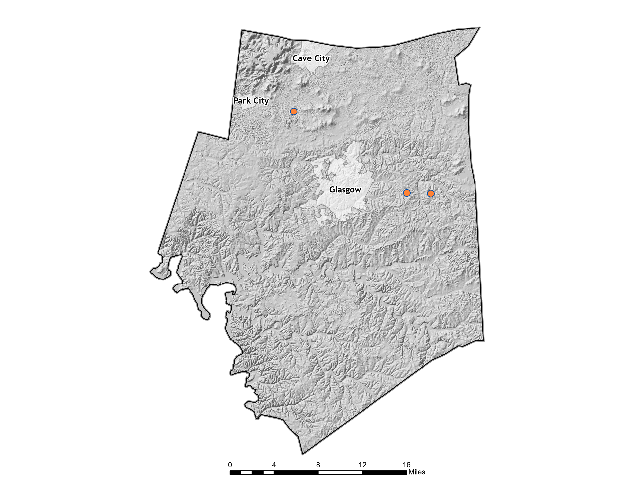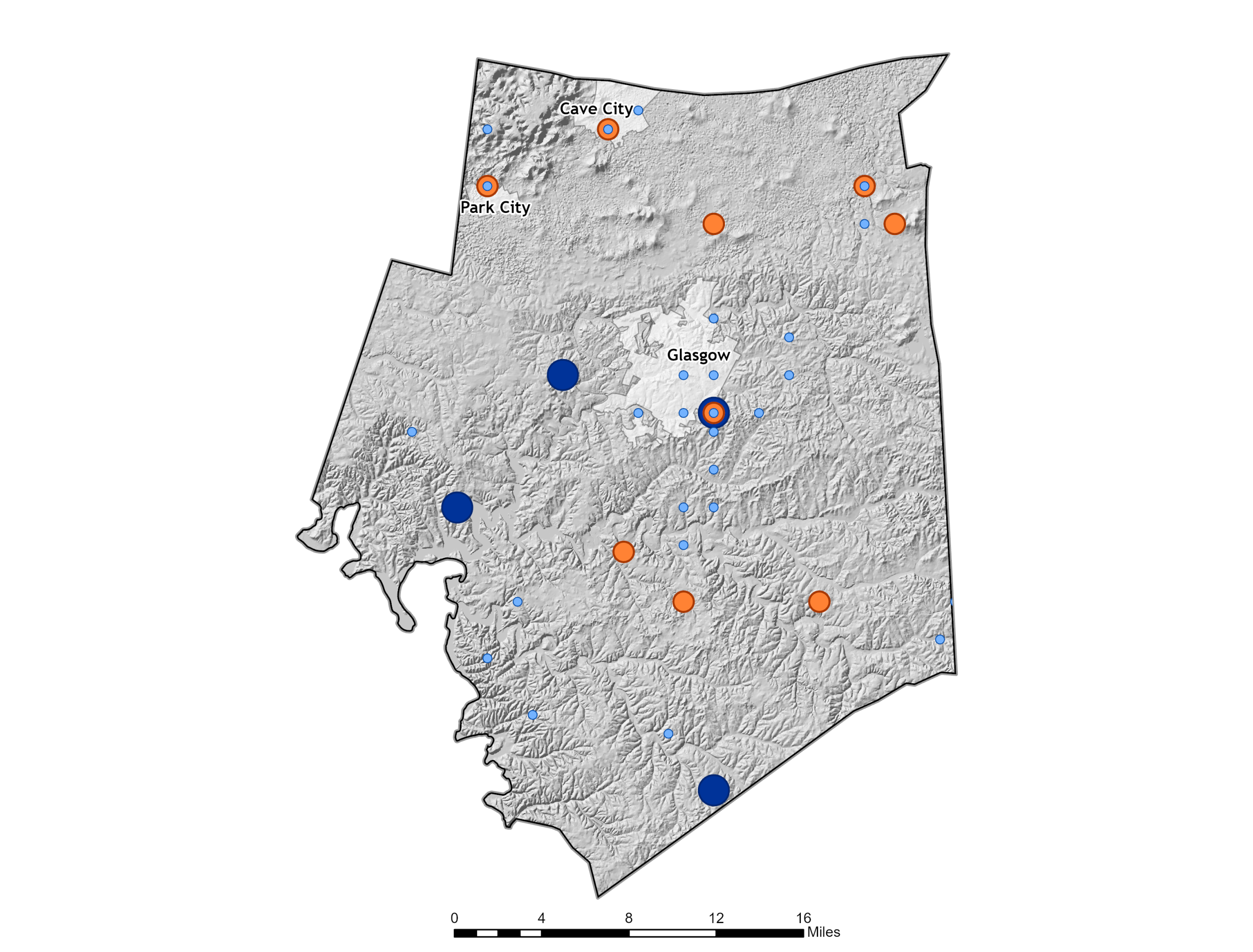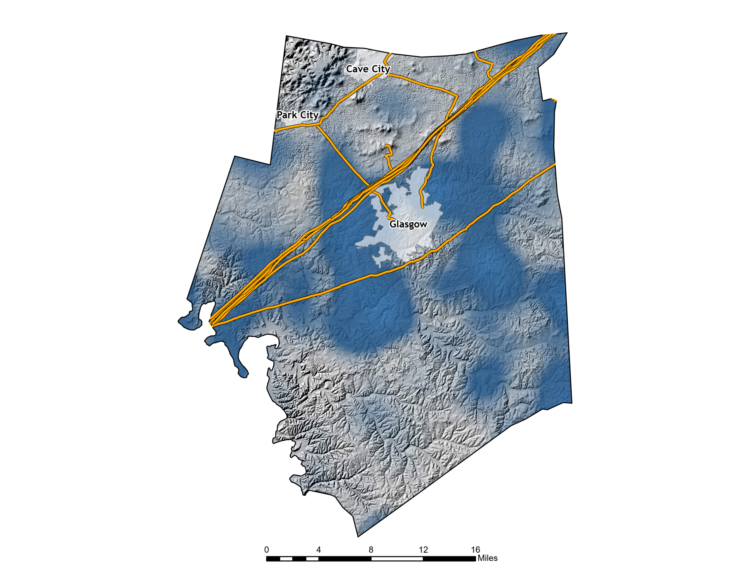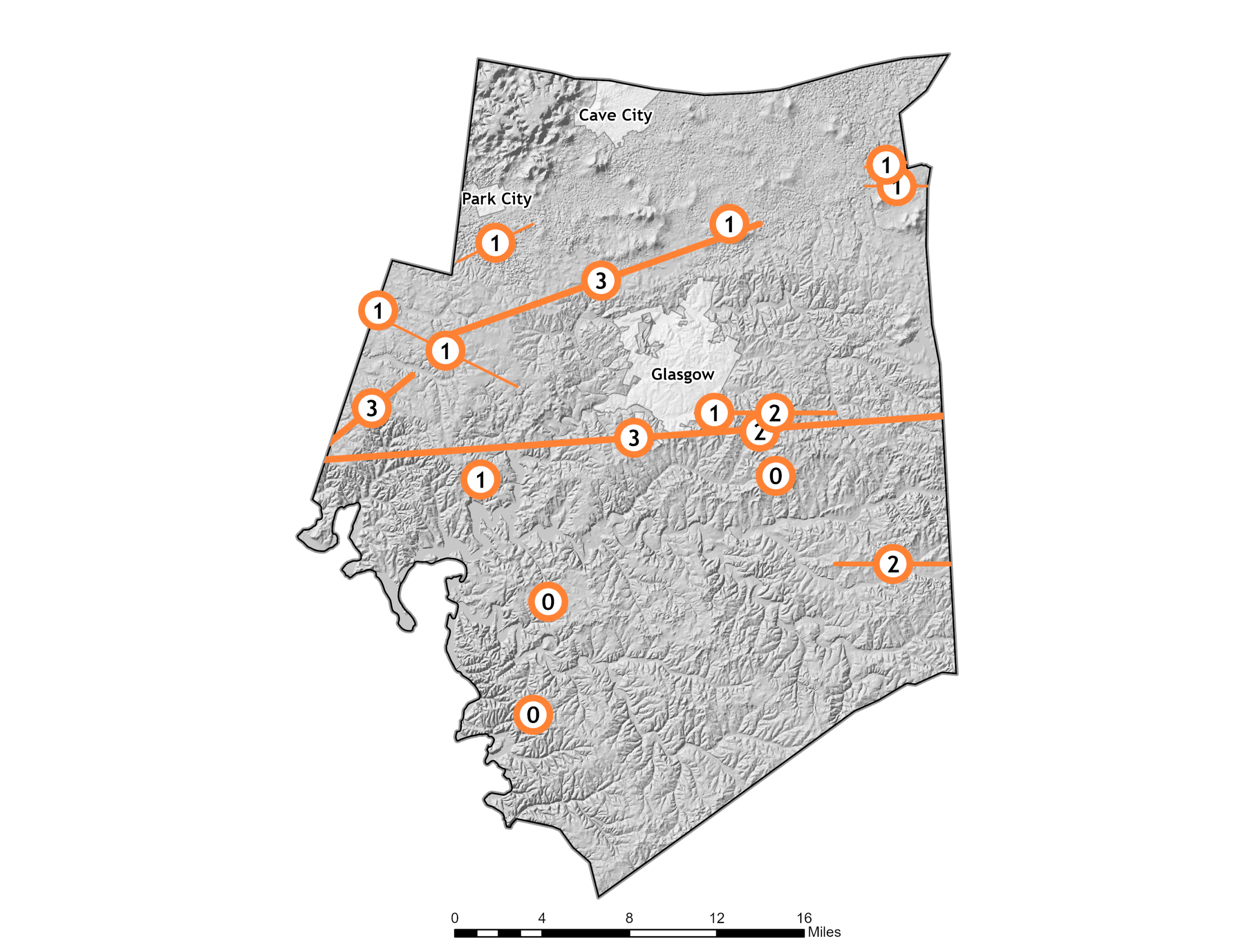 Exposure is countywide (non-spatial at the planning scale), with impacts most evident where people, infrastructure, and travel corridors concentrate (e.g., Cave City, Glasgow, Park City, and major roads)