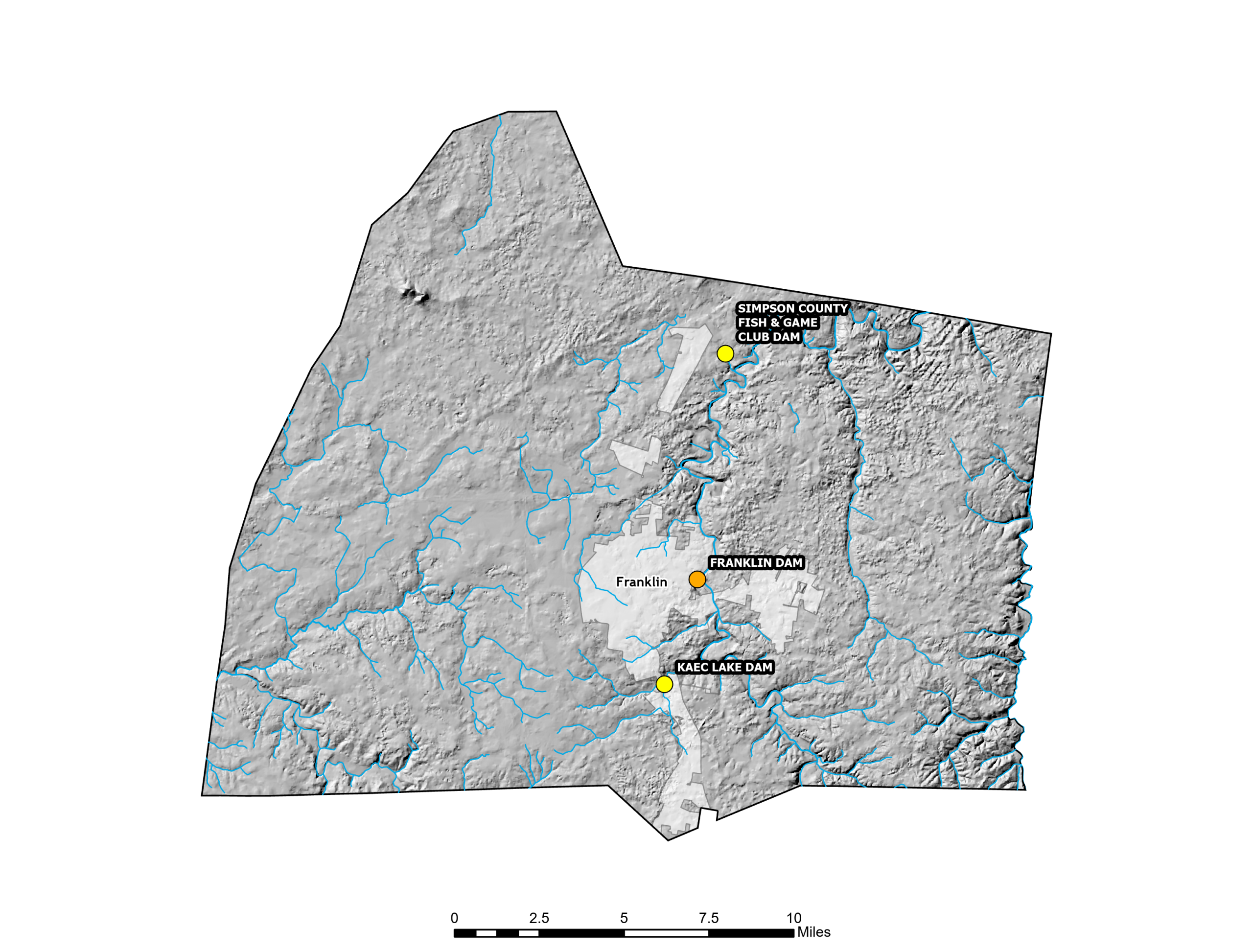 Overall, Simpson County’s vulnerability is characterized as Low, with localized Low-Moderate vulnerability in downstream areas of aging or privately maintained dams lacking regular inspection or documented maintenance.