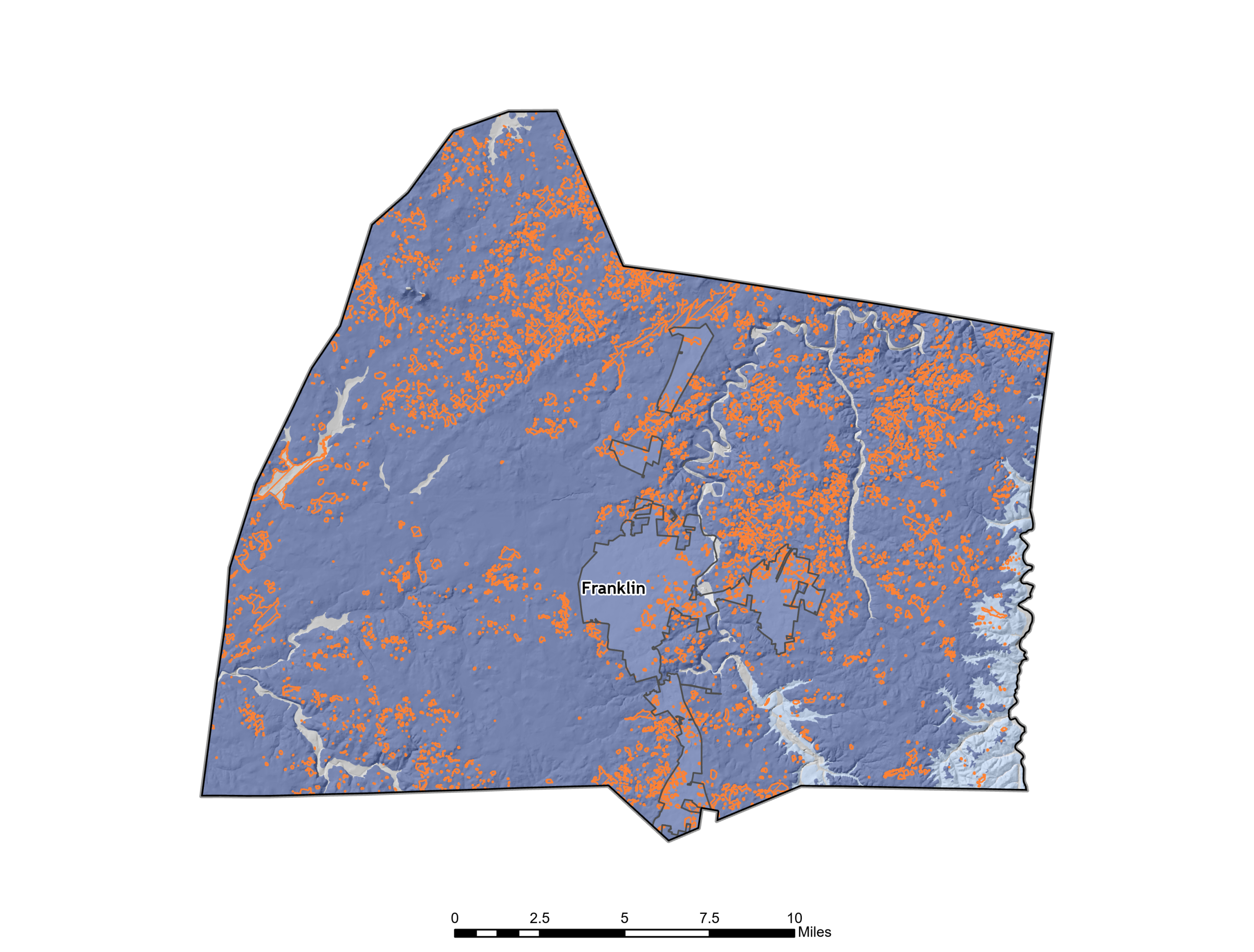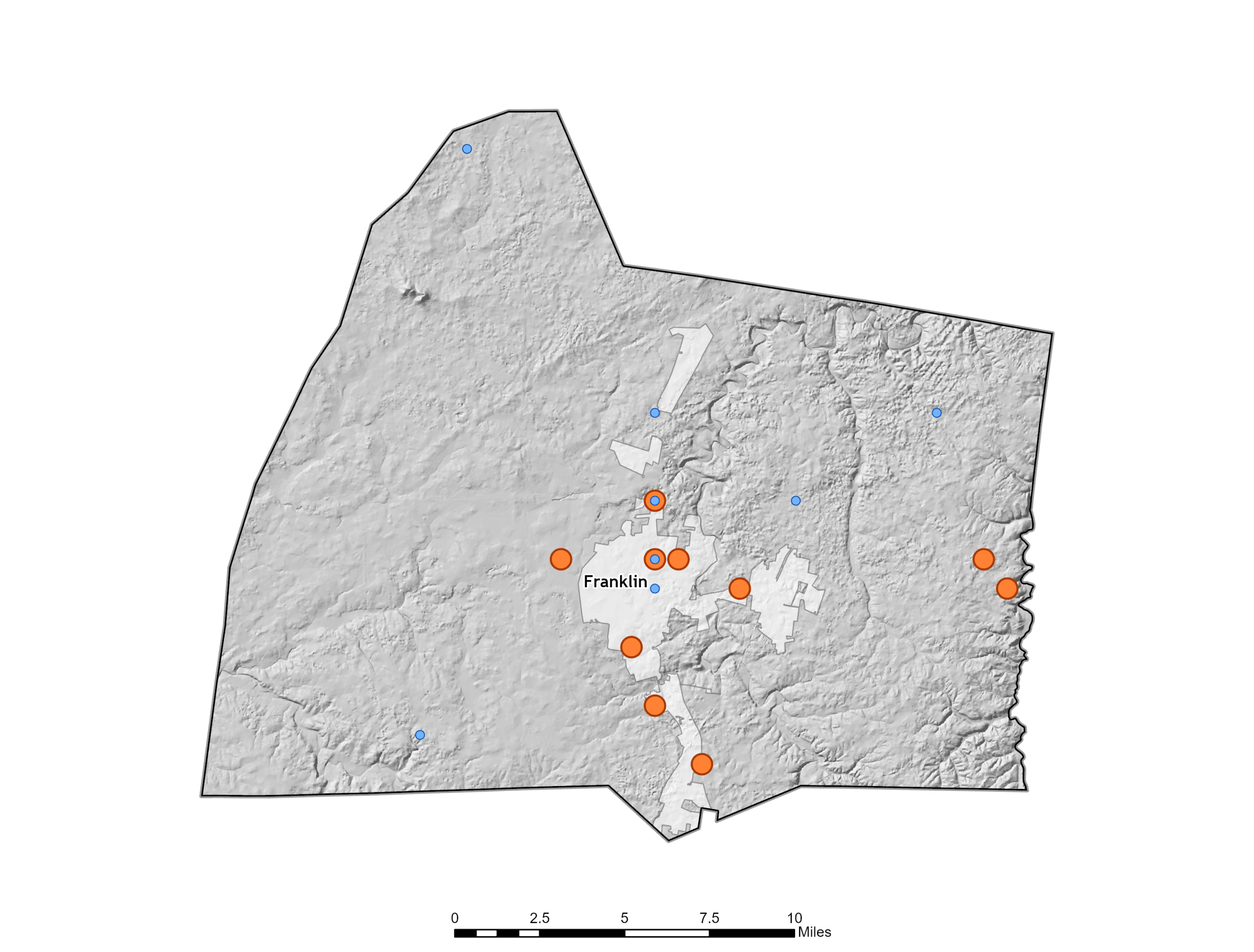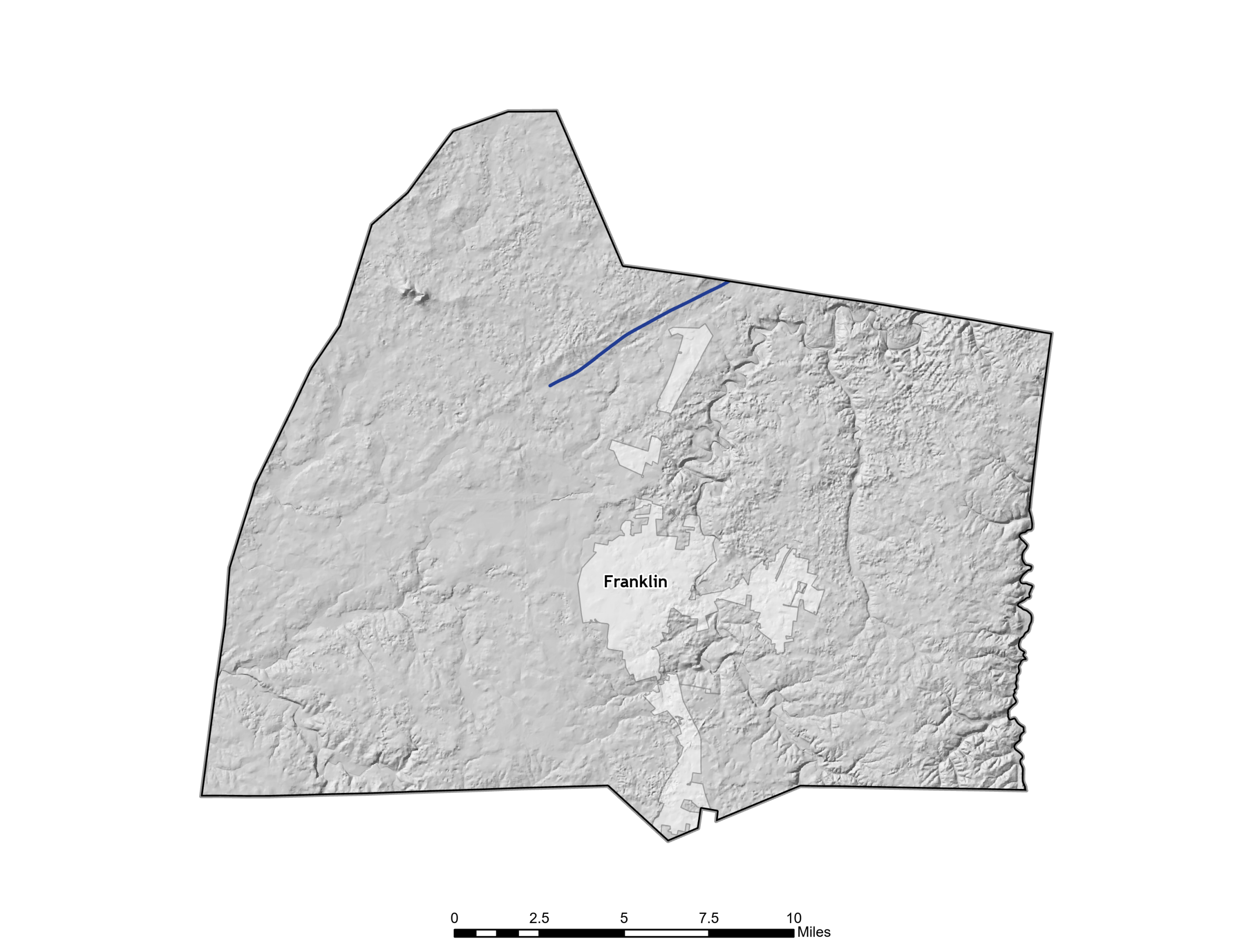 Simpson County’s vulnerability is shaped by its strong agricultural base, reliance on surface and groundwater resources in rural areas, and the exposure of water-dependent industries—particularly those in and around Franklin—to supply constraints during prolonged dry periods. Countywide exposure means that both agricultural operations and municipal systems can be affected: farms through reduced crop yields, stressed pasture and hay production, and impacts to livestock herds, and the City of Franklin through supply management measures, conservation requirements, or rate adjustments when drought persists. Vulnerability is heightened when extended dry conditions coincide with peak seasonal demand, and in areas where smaller rural systems, private wells, or agricultural operations have limited storage capacity, redundancy, or alternative water sources.