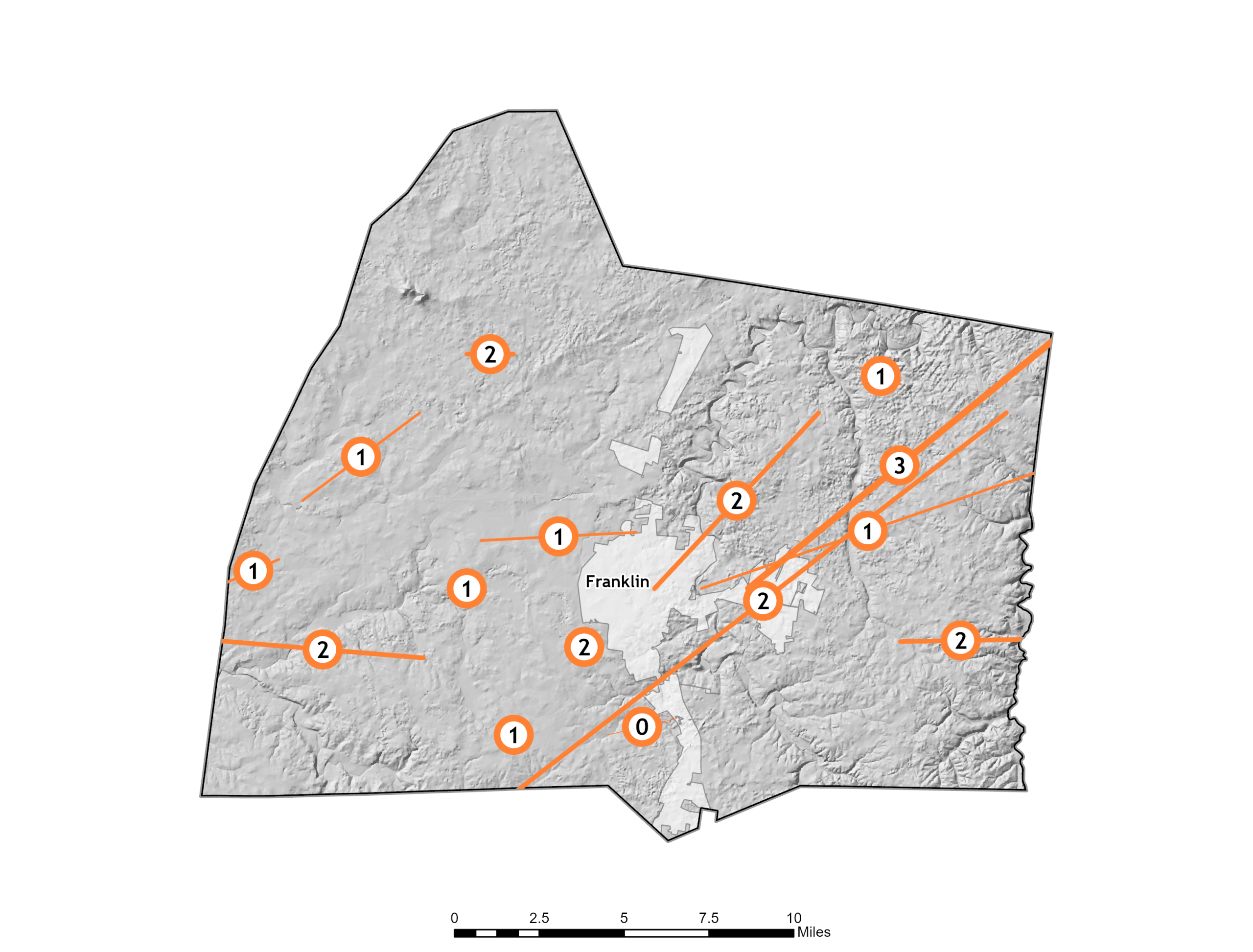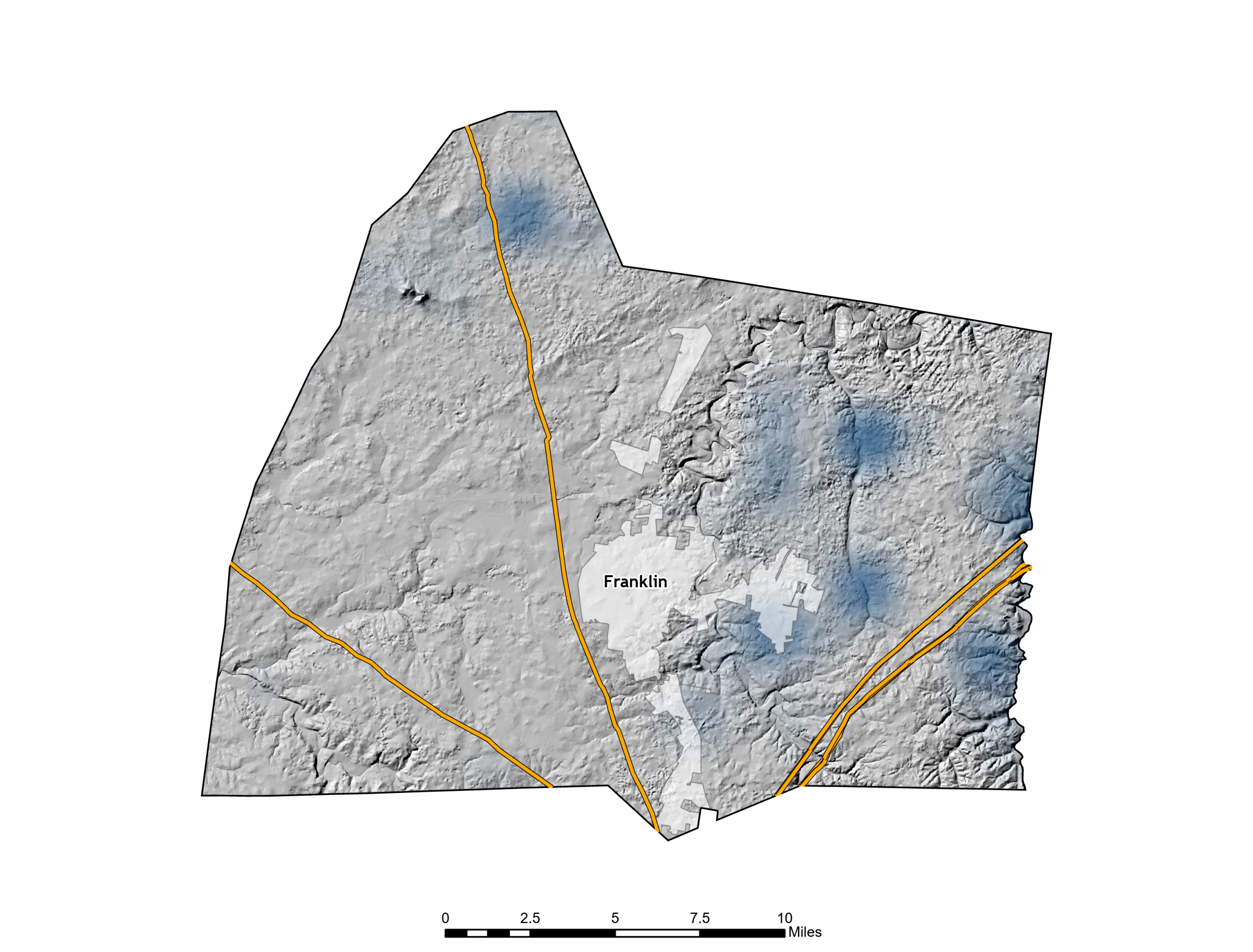 Exposure is countywide (non-spatial at the planning scale), with impacts most evident where people, infrastructure, and travel corridors concentrate (e.g., Franklin and major roads)
